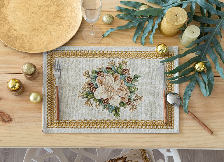 Set individual de mesa de tejido Jacquard con flor central navideña. Con tonos dorados y marrones. Es un set individual muy elegante gracias al toque de brillo que le proporciona el lurex. Lavable. CANDLE
