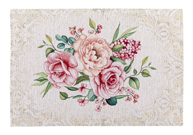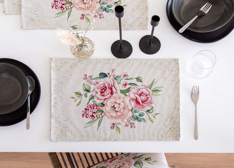 Set individual de mesa de tejido Jacquard con rosas con tonos rosa pastel, hojas verdes y fondo beig PADUA.