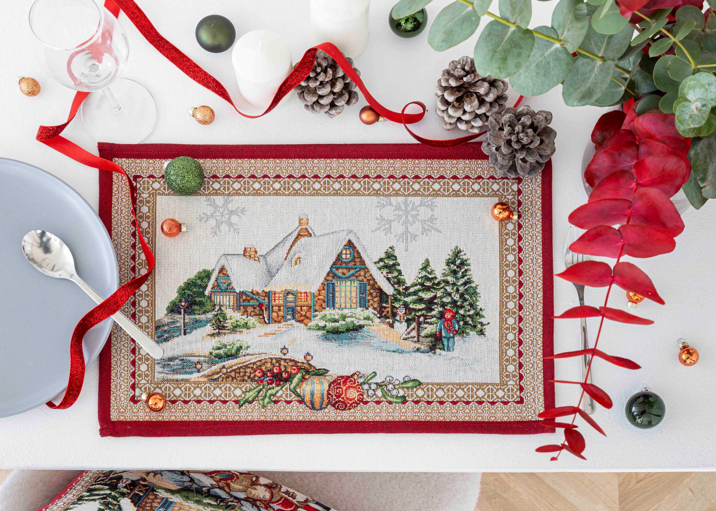 Set individual de mesa de tejido jacquard con casas nevadas. Con tonalidad blanca con detalles rojos y verdes. Lavable. FROSTY