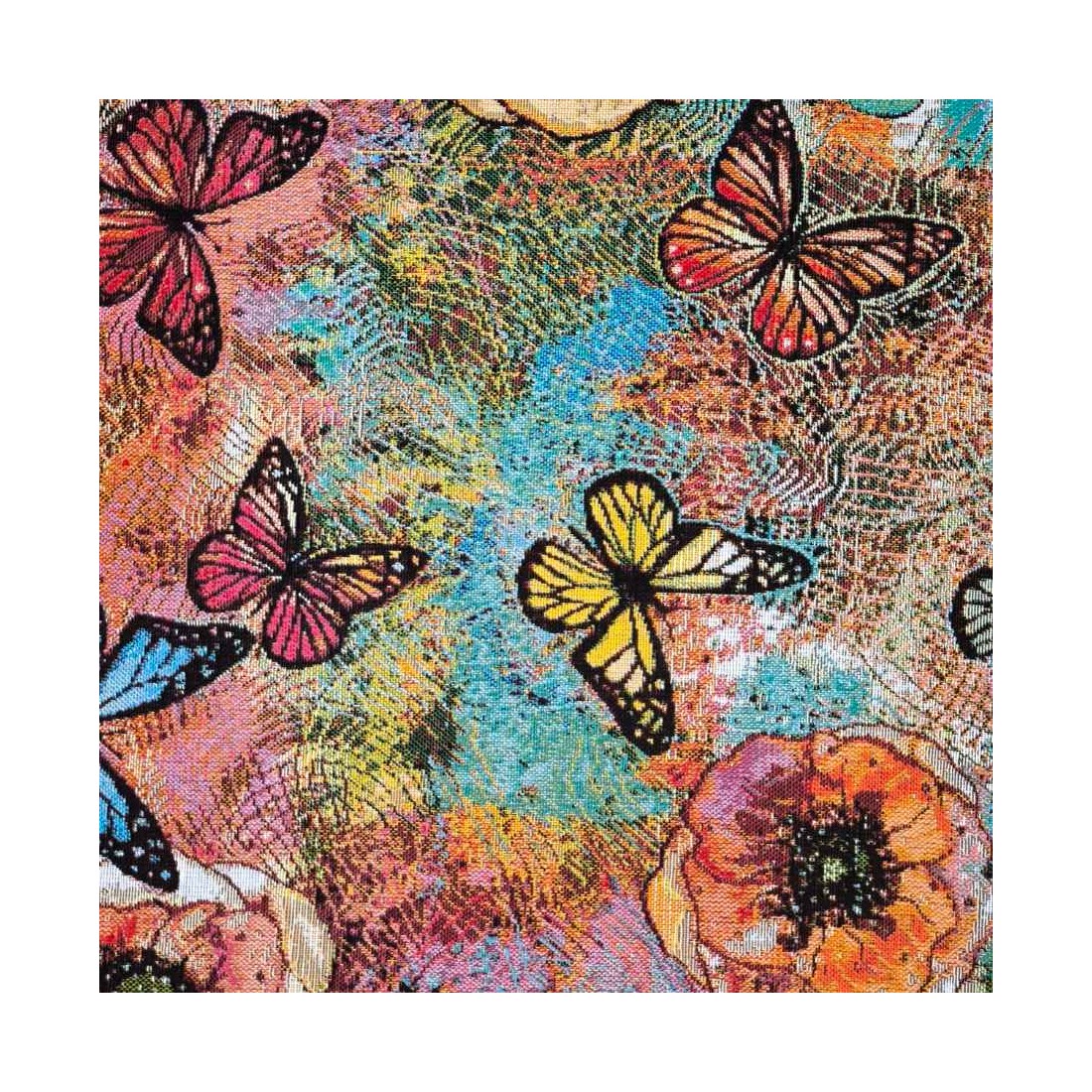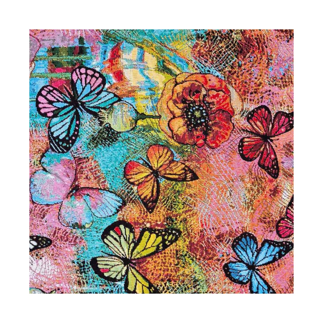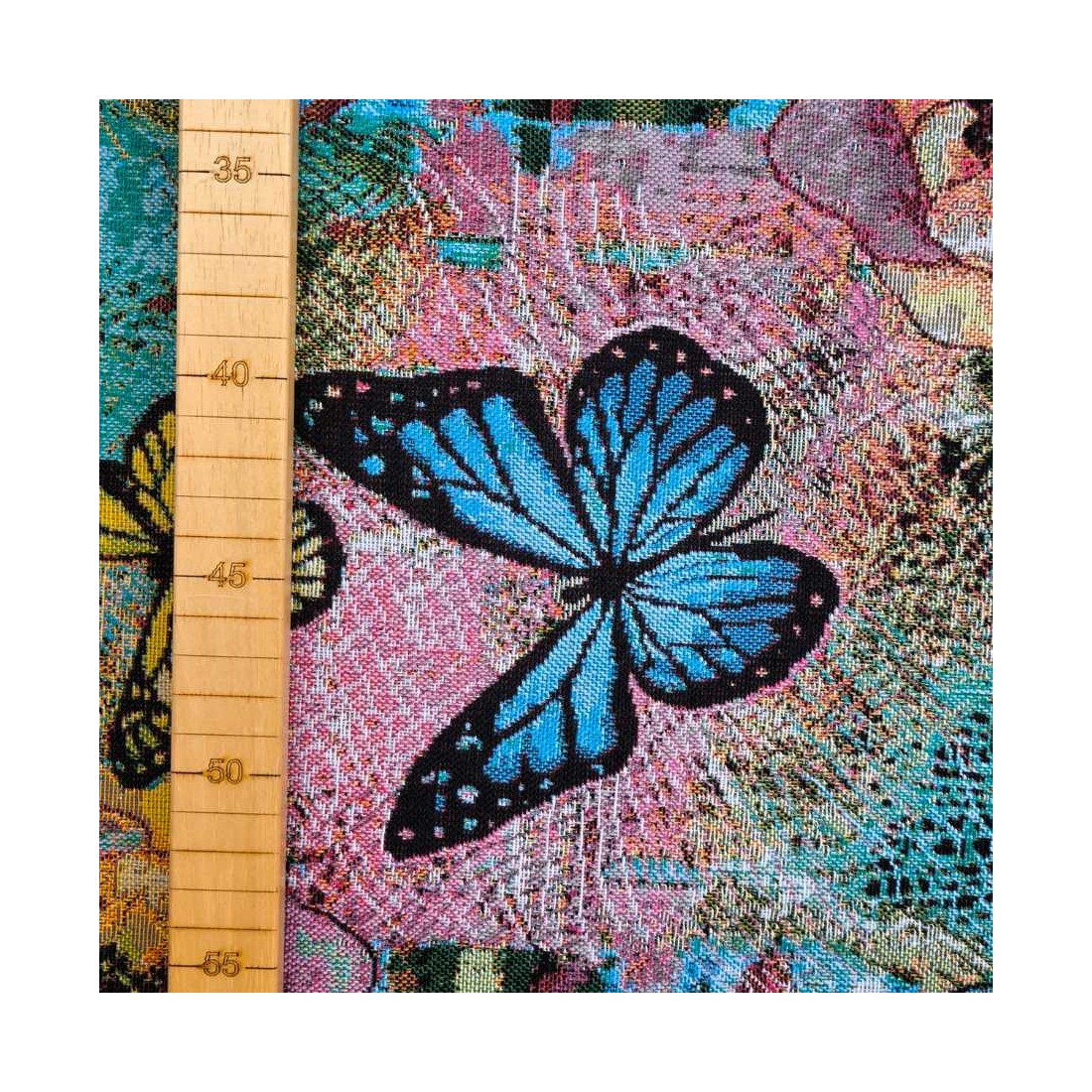 Jacquard fabric AQUAMARINA with multicolored butterflies and blue background. Width 140