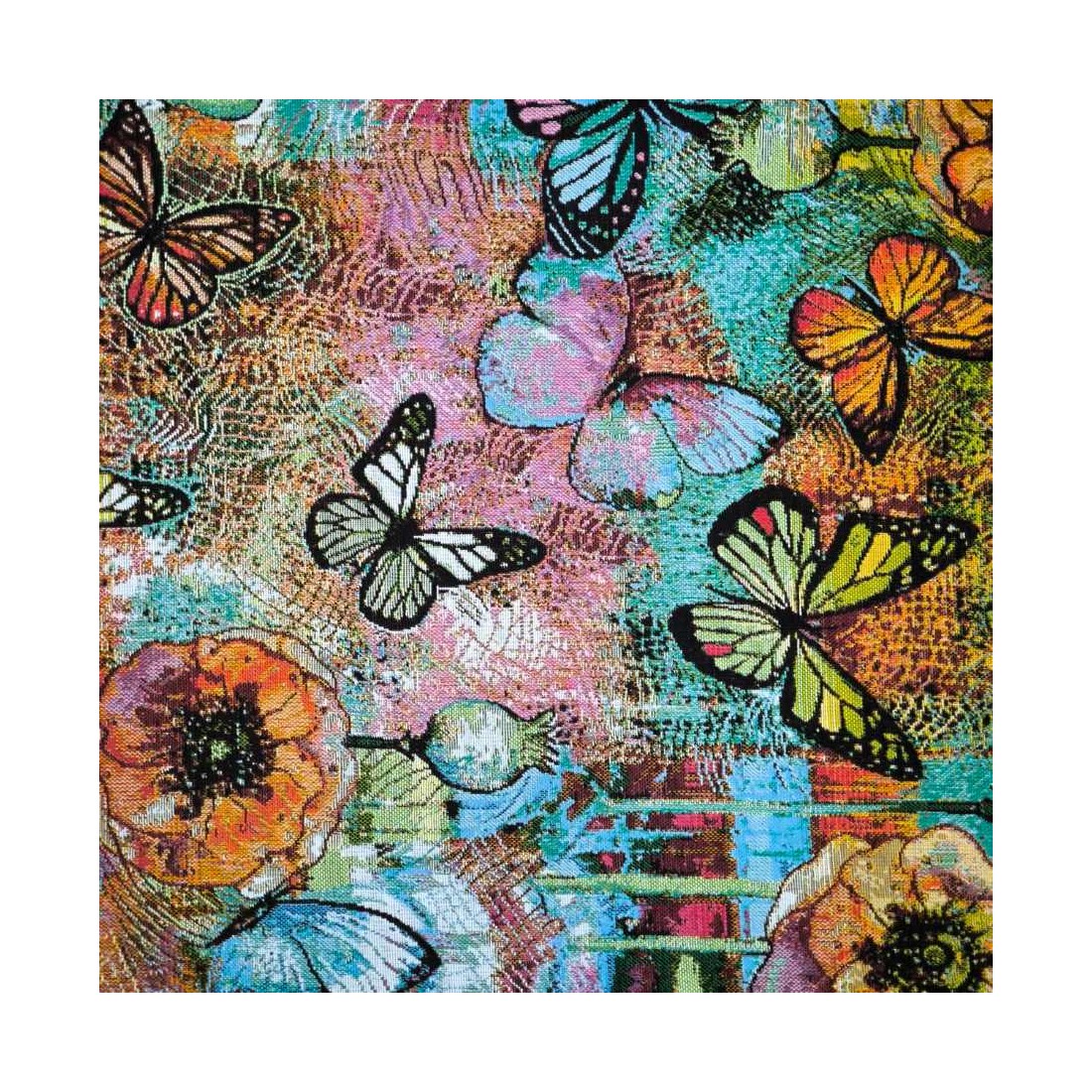 Tejido Jacquard AQUAMARINA con mariposas multicolor y fondo azul. Ancho 140