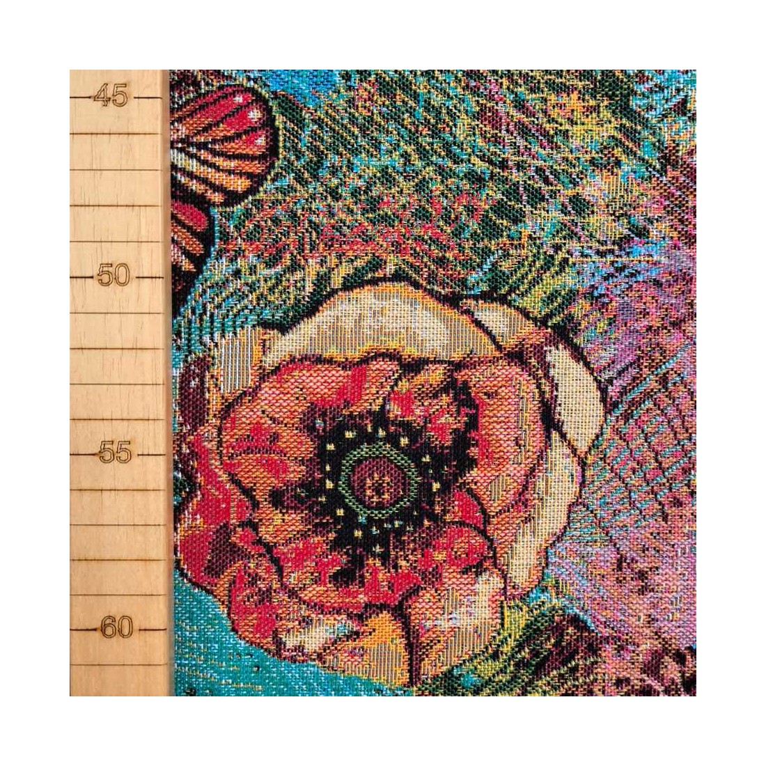Tejido Jacquard con mariposas y flores de diferente colores como amarillas, naranjas y fondo azul AQUAMARINA. Composición: 60% Poliéster, 40% Algodón. Unidad de compra: metros de tela de 140cms de ancho. Peso: 397 g/m2.
