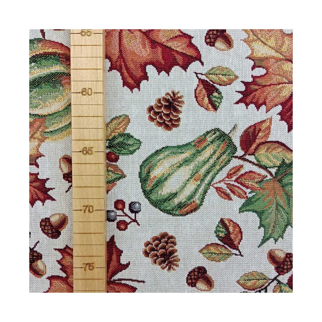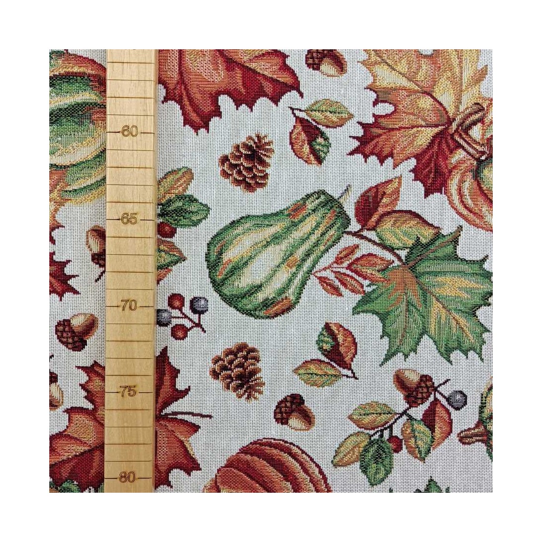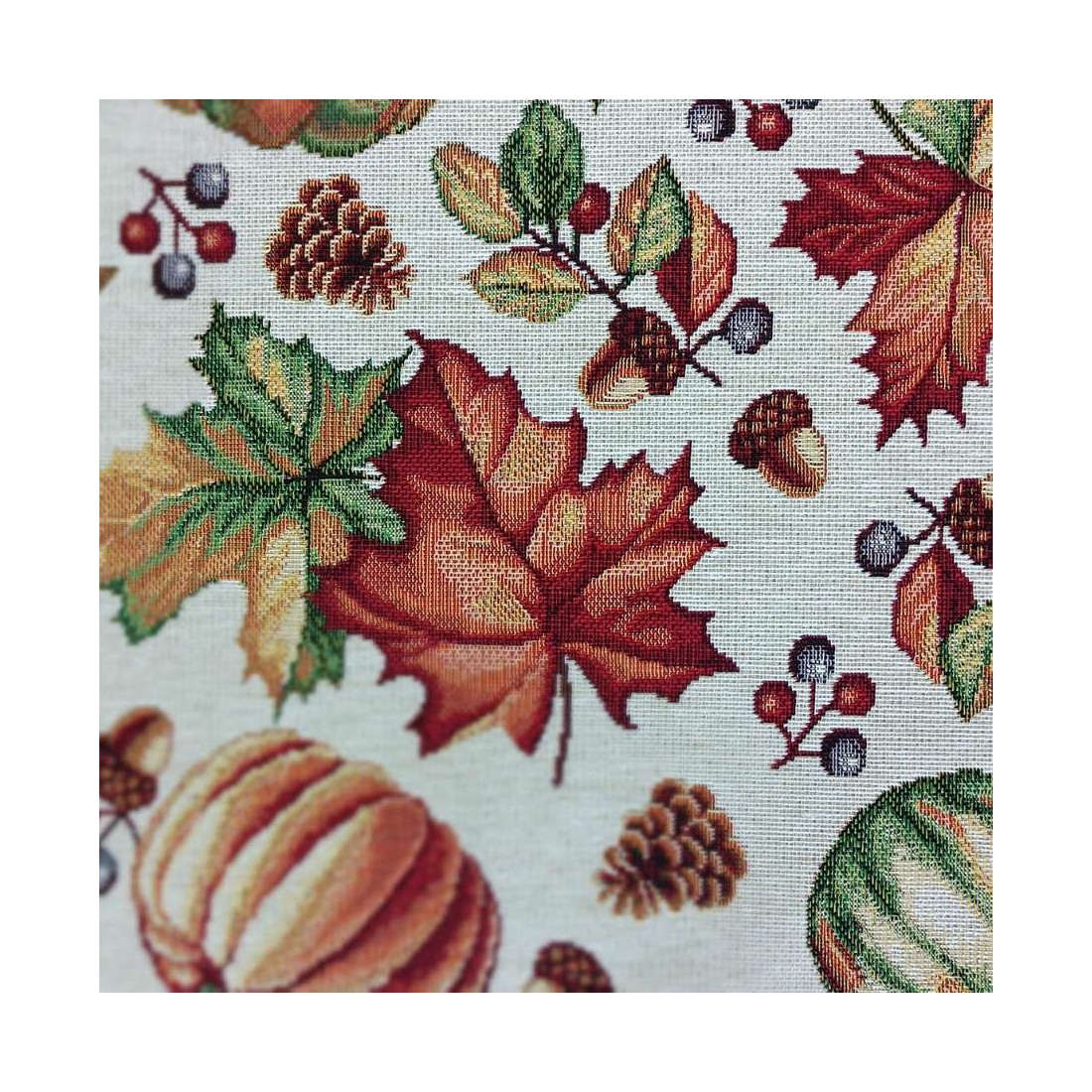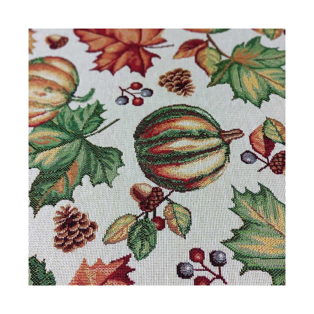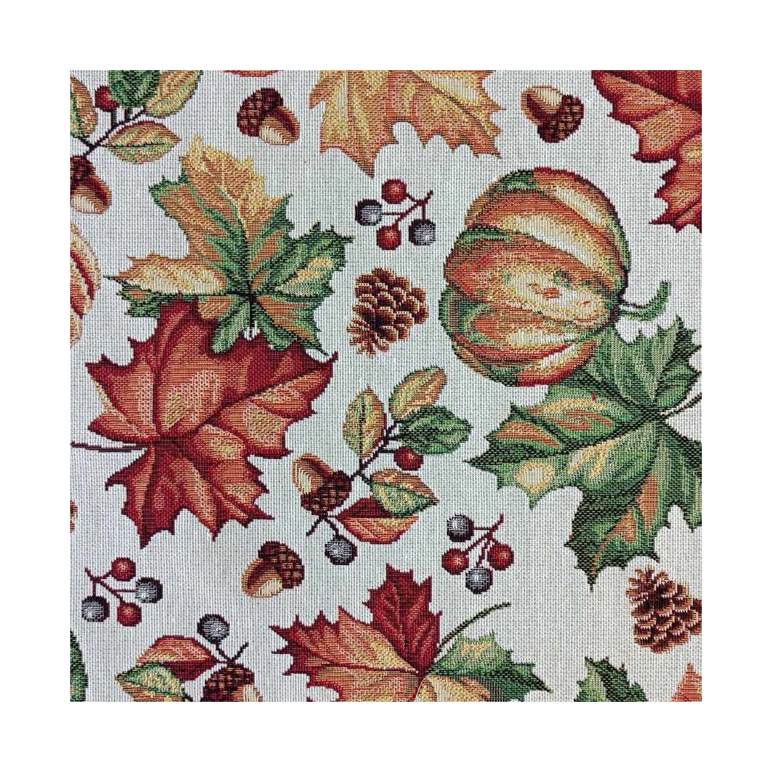 Tejido Jacquard a metros con hojas, calabazas , piñas y motivos otoñales naranjas y verdes. Fondo blanco. AUTUM. Composición: 60% Poliéster, 40% Algodón. Unidad de compra: metros de tela de 140cms de ancho. Peso: 397 g/m2.